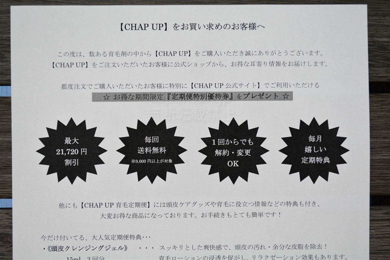 中には、チャップアップの推奨使用方法とチャップアップで発毛に成功した人の体験談・失敗しない為の育毛アドバイスが記載されています。