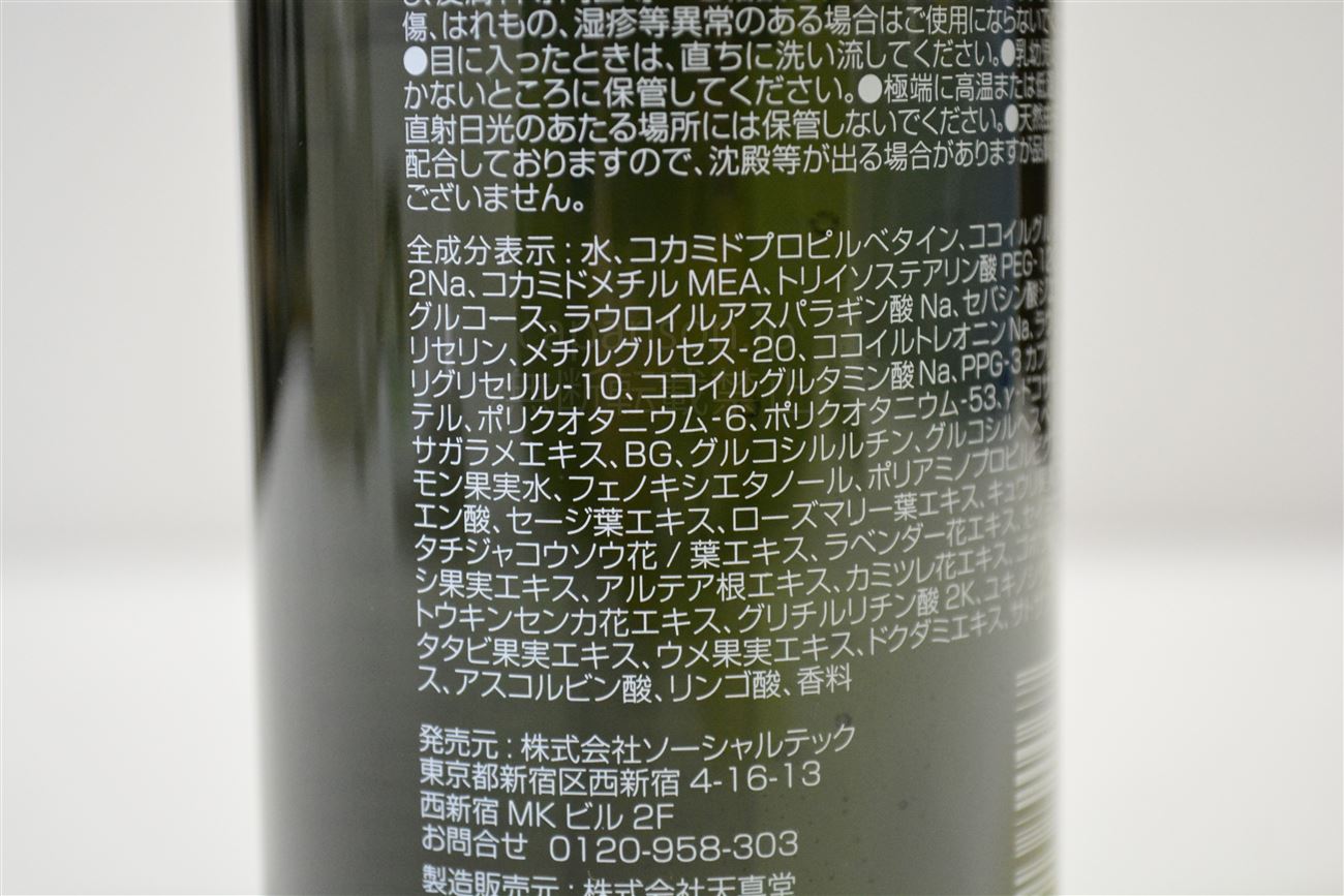 水、コカミドプロピルベタイン、ココイルグルタミン酸2Na、コカミドメチルMEA、トリイソステアリン酸PEG-120メチルグルコース、ラウロイルアスパラギン酸Na、セバシン酸ジエチル、グリセリン、メチルグルセス-20、ココイルトレオニンNa、ラウリン酸ポリグリセル-10、ココイルグルタミン酸Na、PPG-3カプリリルエーテル、ポリクオタニウム-6、ポリクオタニウム-53、γ-ドコサラクトン、サガラメエキス、BG、グルコシルルチン、グルコシルヘスペリジン、レモン果実水、フェノキシエタノール、ポリアミノプロピルビグアニド、クエン酸、セージ葉エキス、ローズマリー葉エキス、キュウリ果実エキス、タチジャコウソウ花/葉エキス、ラベンダー花エキス、セイヨウサンザシ果実エキス、アルテア根エキス、カミツレ花エキス、ゴボウ根エキス、トウキンセンカ花エキス、グリチルリチン酸2K、ユキノシタエキス、マタタビ果実エキス、ウメ果実エキス、ドクダミエキス、サトザクラ花エキス、アスコルビン酸、リンゴ酸、香料